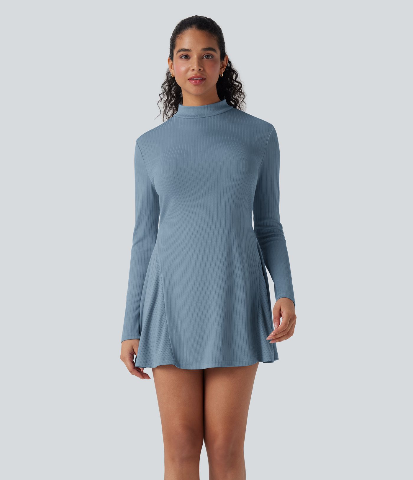 Ribbed Knit Mock-neck Long Sleeve Mini Casual Dress