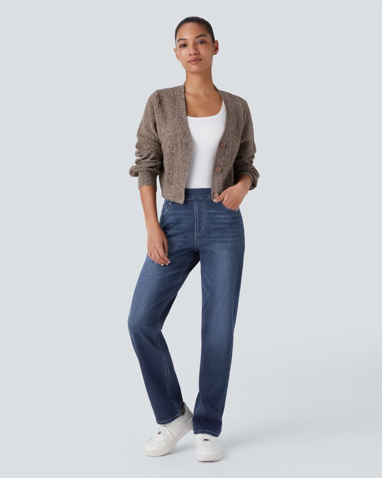 Halara Flex™ Jeans Casuais de Malha Elástica Lavada com Pernas Retas, Cintura Alta e Múltiplos Bolsos