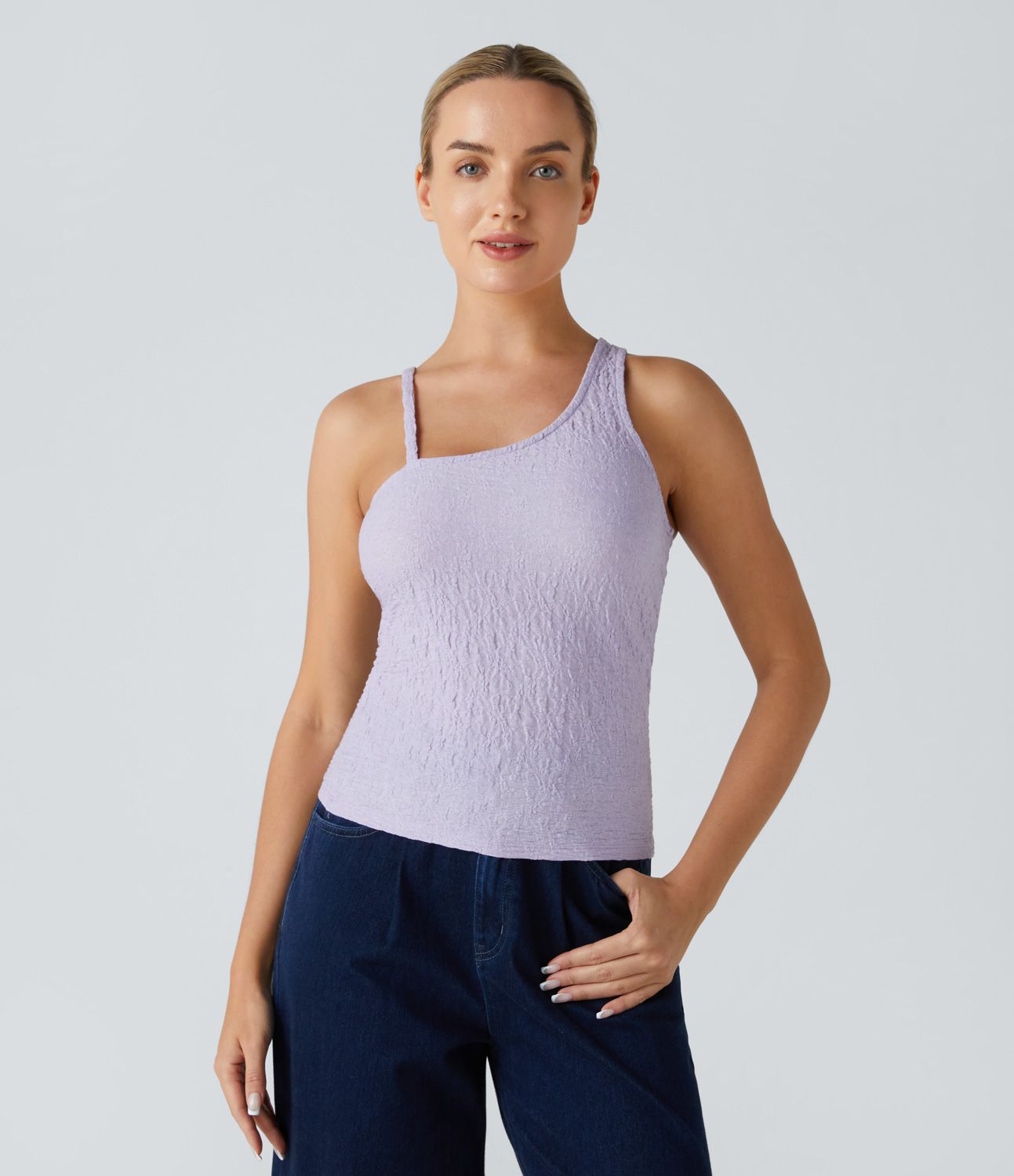 Rento tankkitoppi kapealla, strukturoidulla reunuksella ja epäsymmetrisillä olkaimilla
