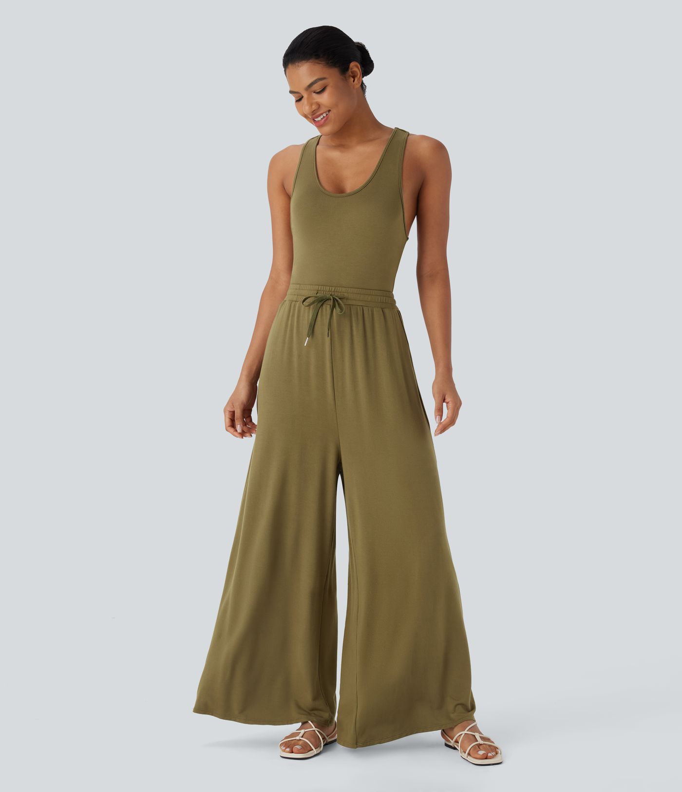 U-hals racerback casual jumpsuit med snøre og lommer