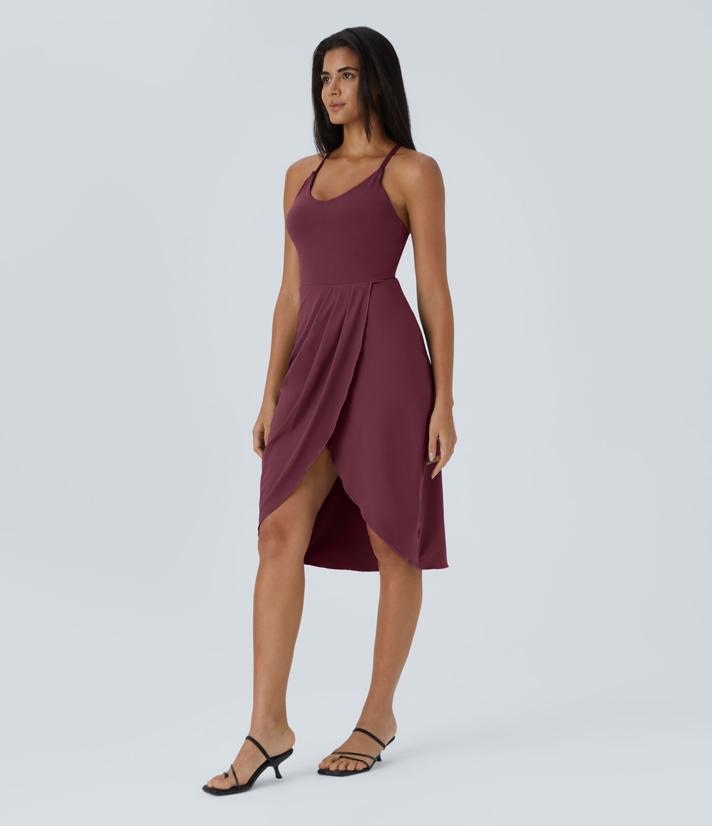 Backless Racerback Split Asymmetric Hem Ruched Casual Midi Dress-No Liner Shorts
