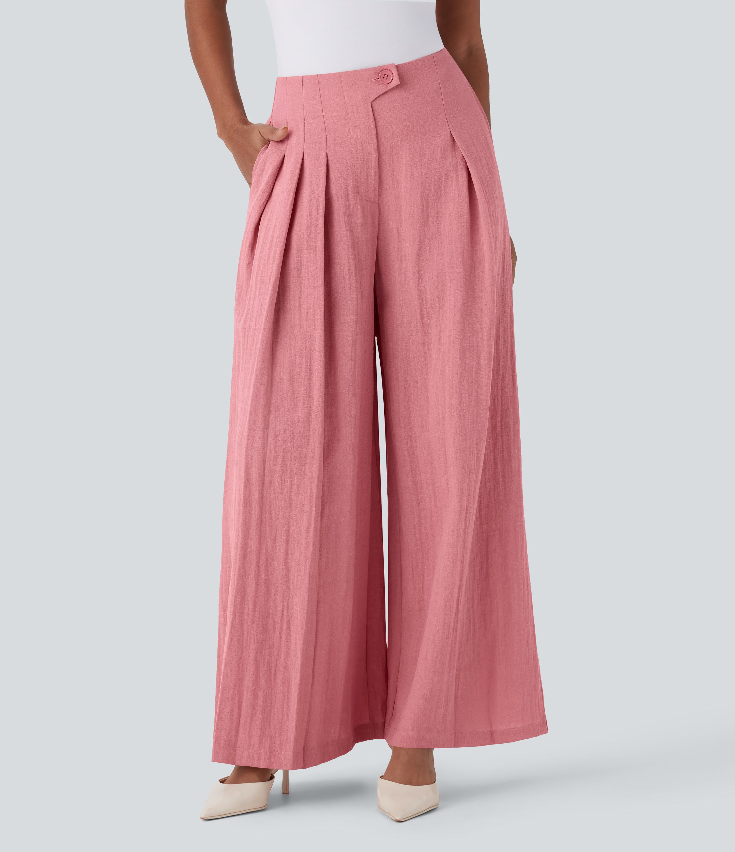 Szerokie spodnie robocze z wysokim stanem, imitujące len, z kieszeniami