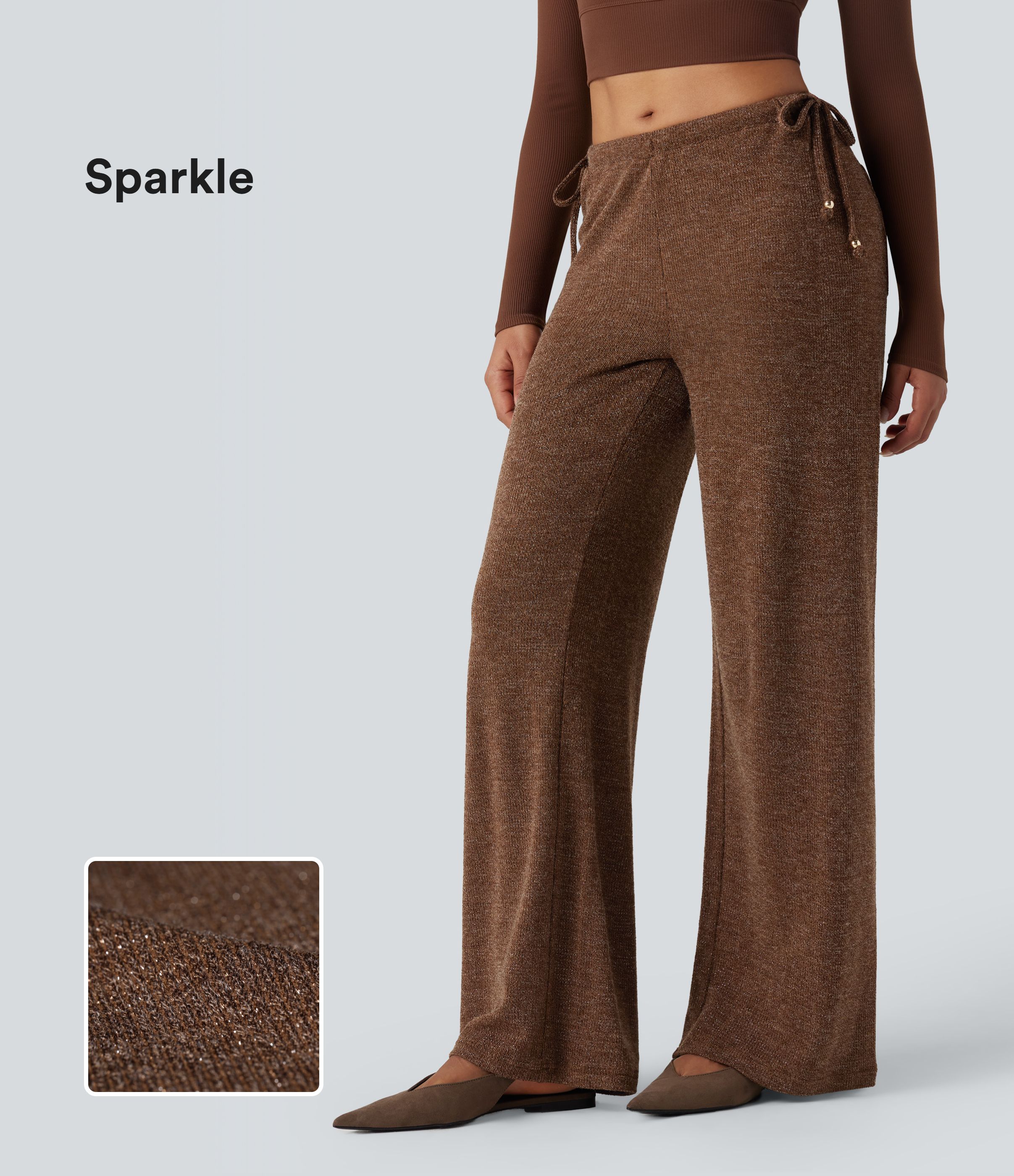 Priložnostne hlače iz rebraste pletenine z metalnim učinkom, s srednjim pasom, z zavezovalno vrvico, širokimi hlačnicami in žepi
