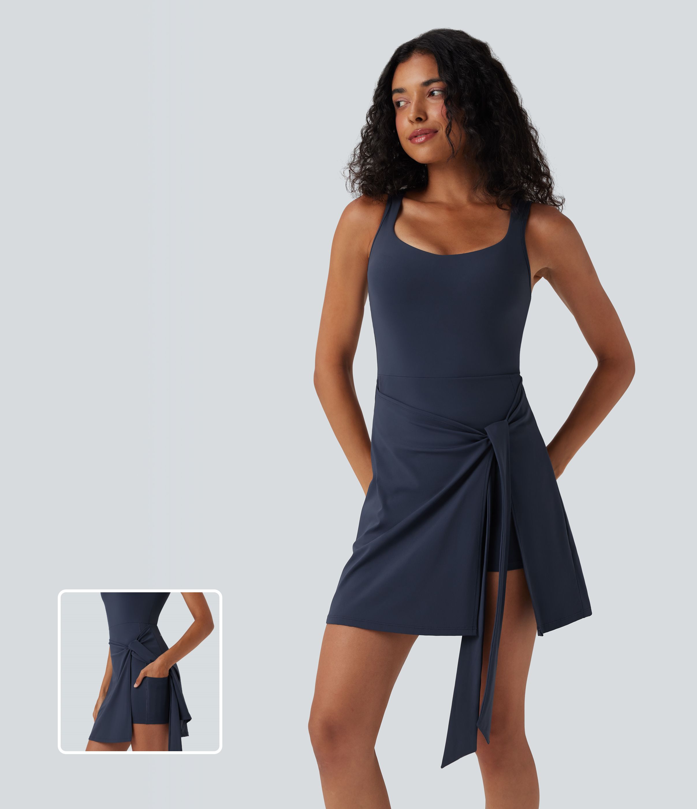 SoftlyZero™ Airy Sleeveless Tie Front 2-in-1 Cool Touch Mini Workout Dress with Pockets