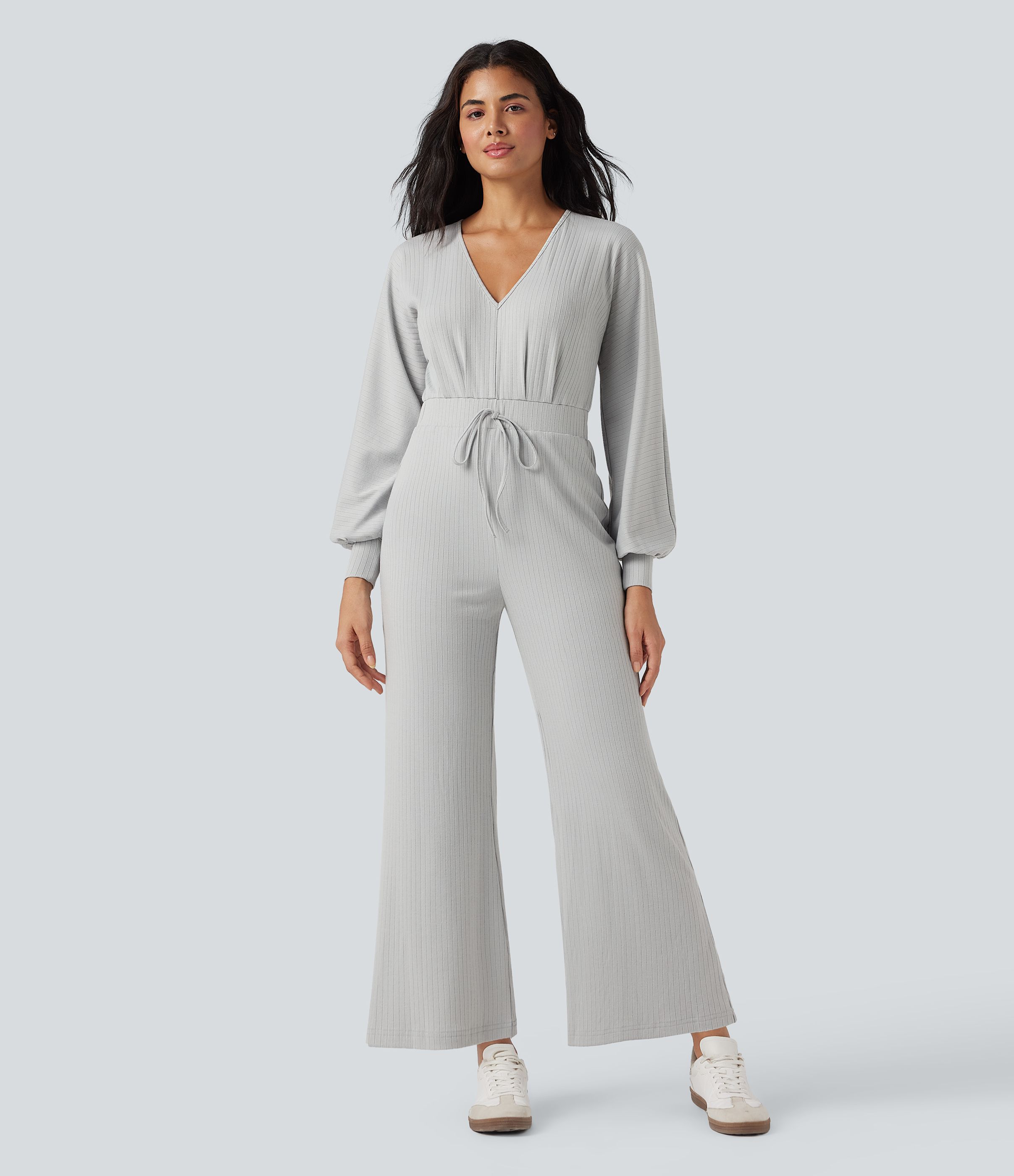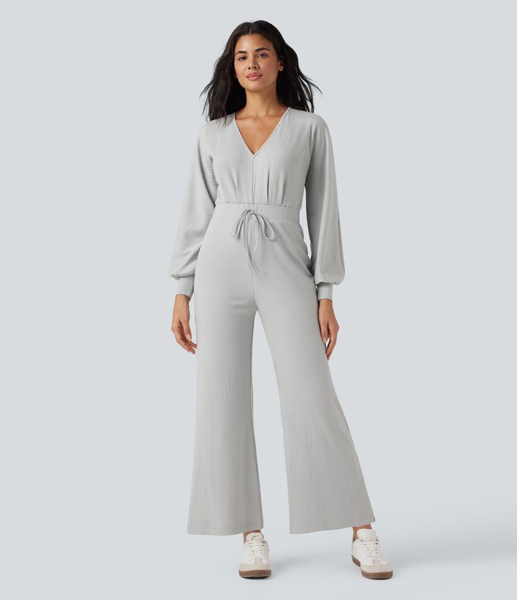 Macacão casual com decote em V, abertura em forma de gota nas costas, mangas compridas e perna larga