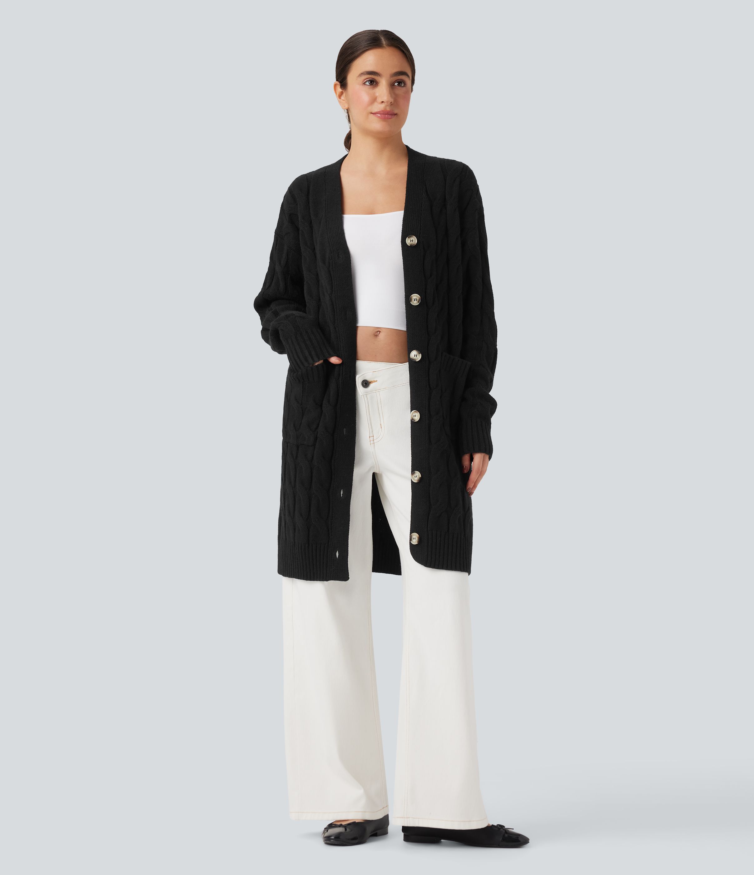 V-образно деколте, дълъг ръкав, удължена casual жилетка с джобове