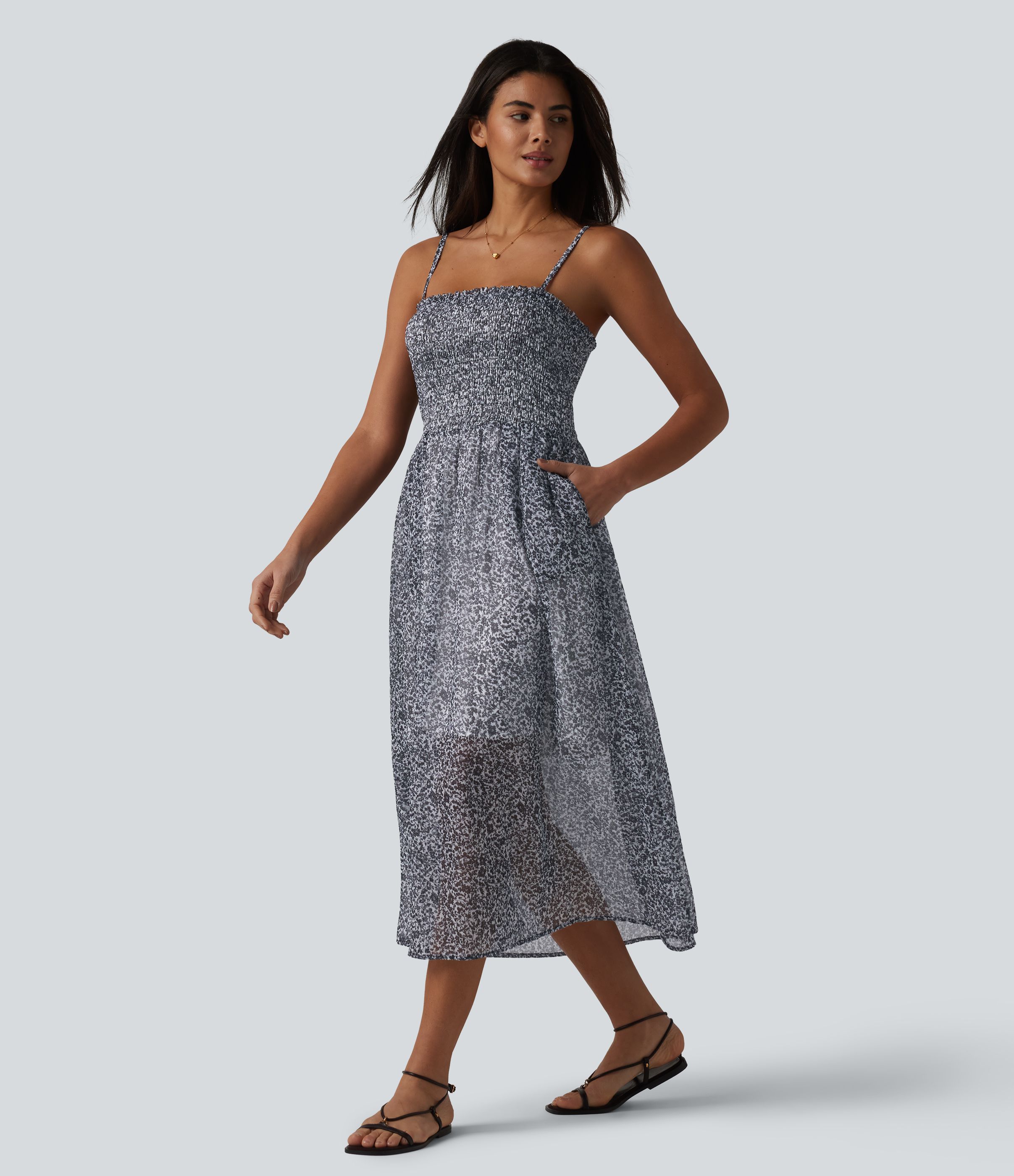 Adjustable Straps Shirred Ditsy Floral Print Chiffon Flowy Midi Casual Slip Dress with Pockets