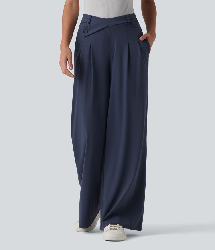 Asymmetric Mid Rise Flare Work Pants with Pockets