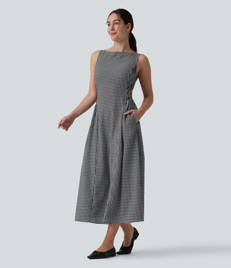 Boat Neck Sleeveless Plaid Flowy Maxi Casual Linen-Feel Dress with Pockets