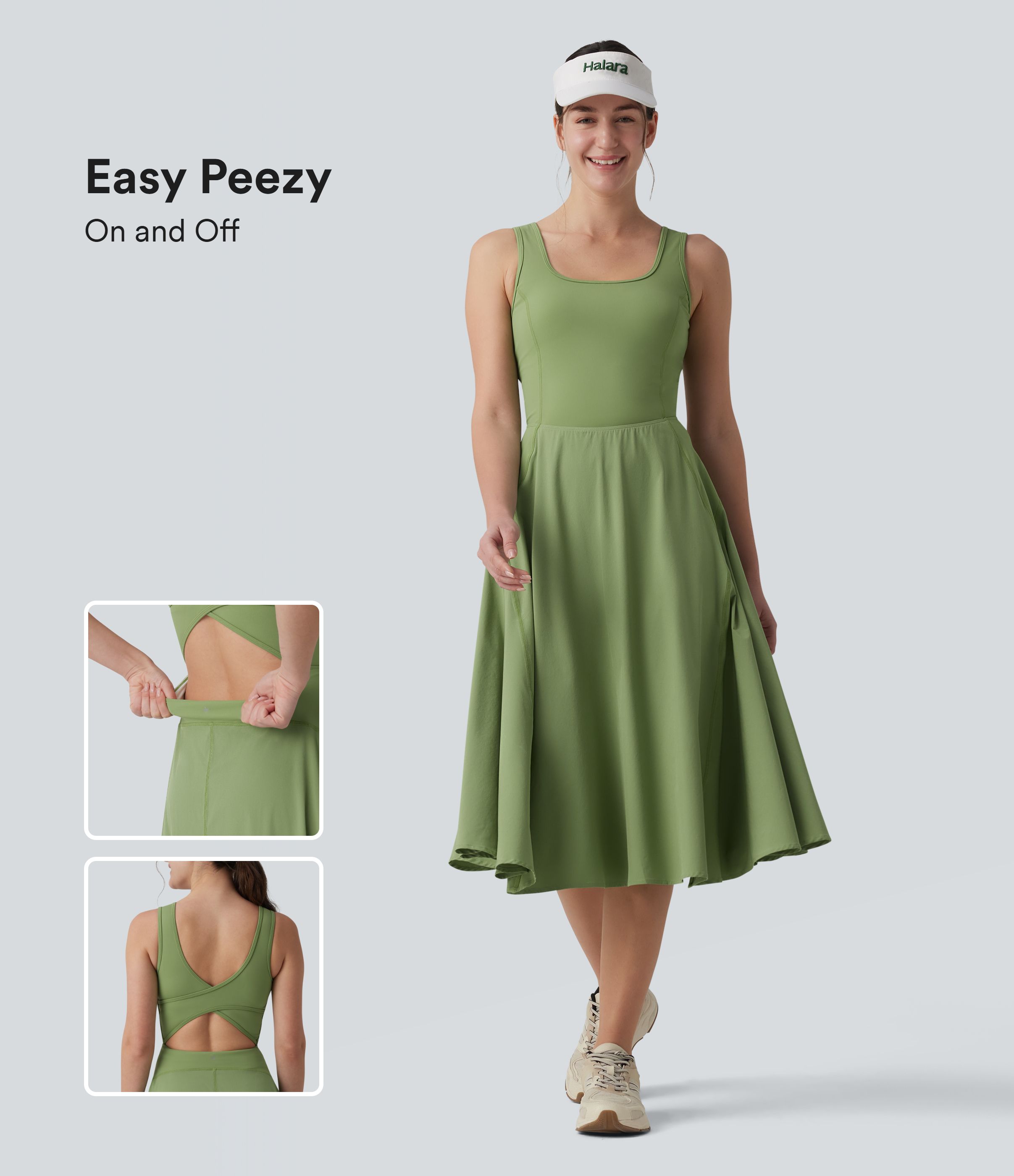 Breezeful™ Square Neck Crisscross Backless Built-in Bra 2-in-1 Midi Quick Dry Dance Active Dress with Pocket-Easy Peezy