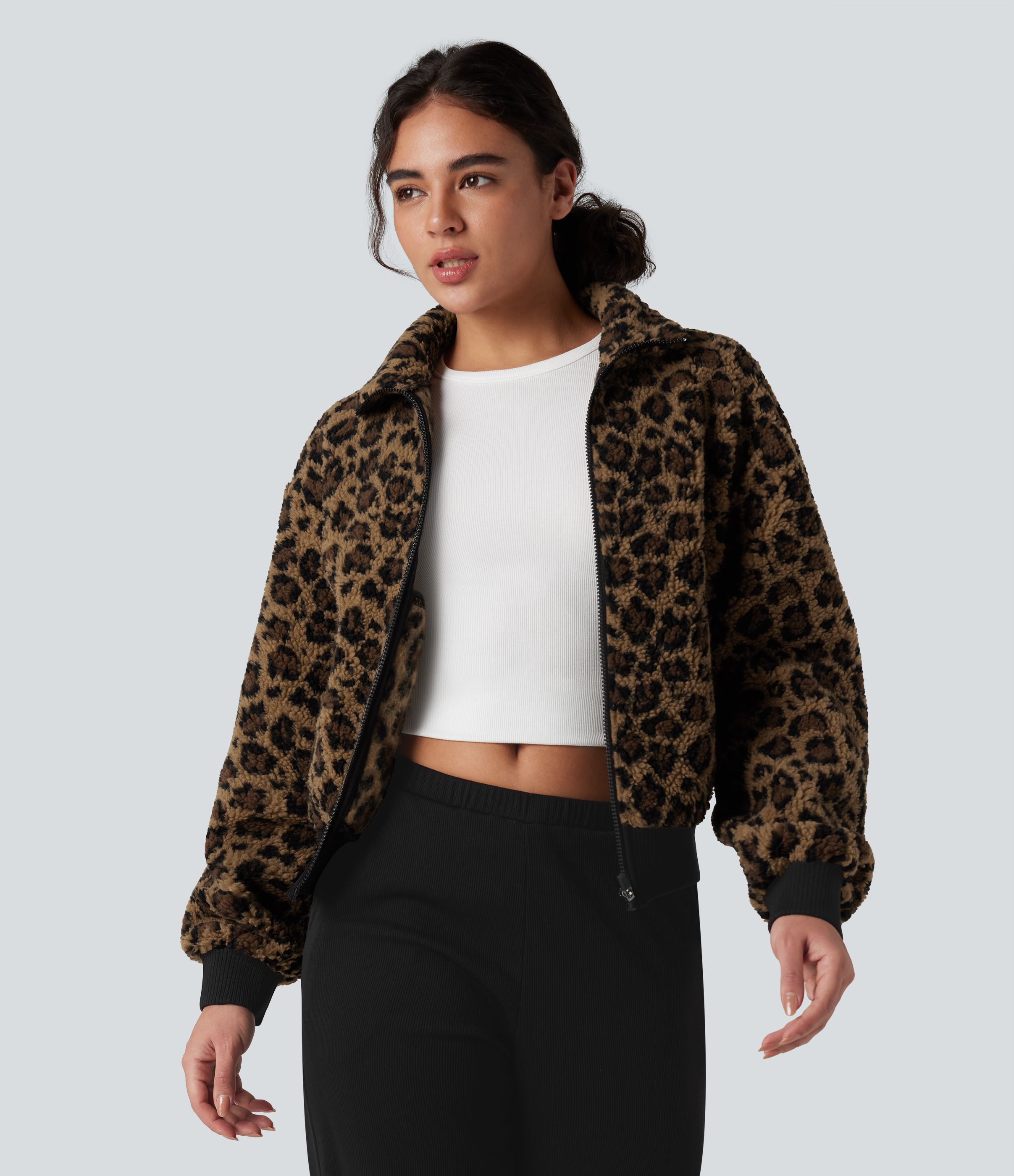 High-neck Contrast Ribbed Zip Fly Casual Sherpa Jacket with Pockets
