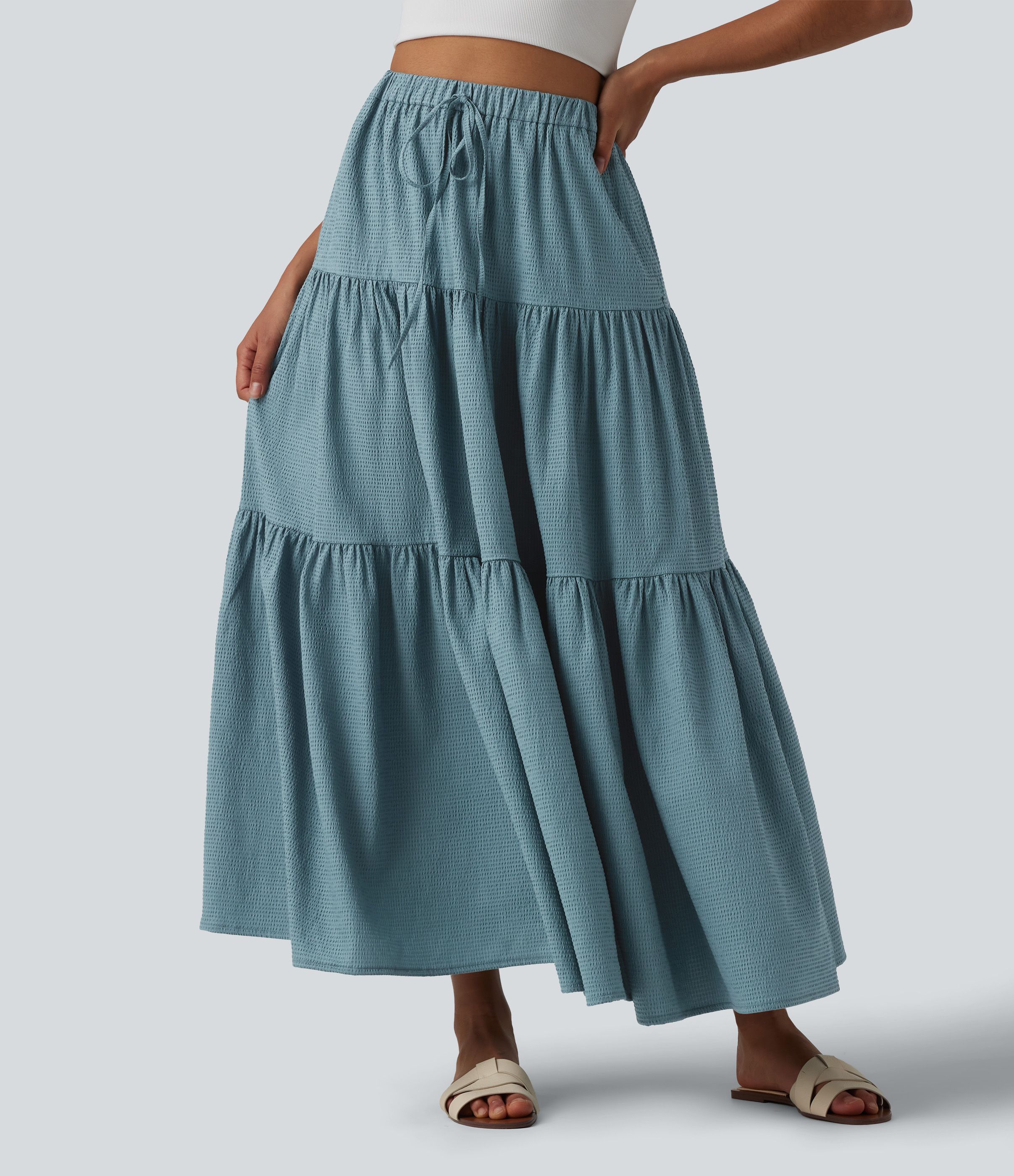 High Waisted Drawstring Flowy Maxi Skirt with Pocket