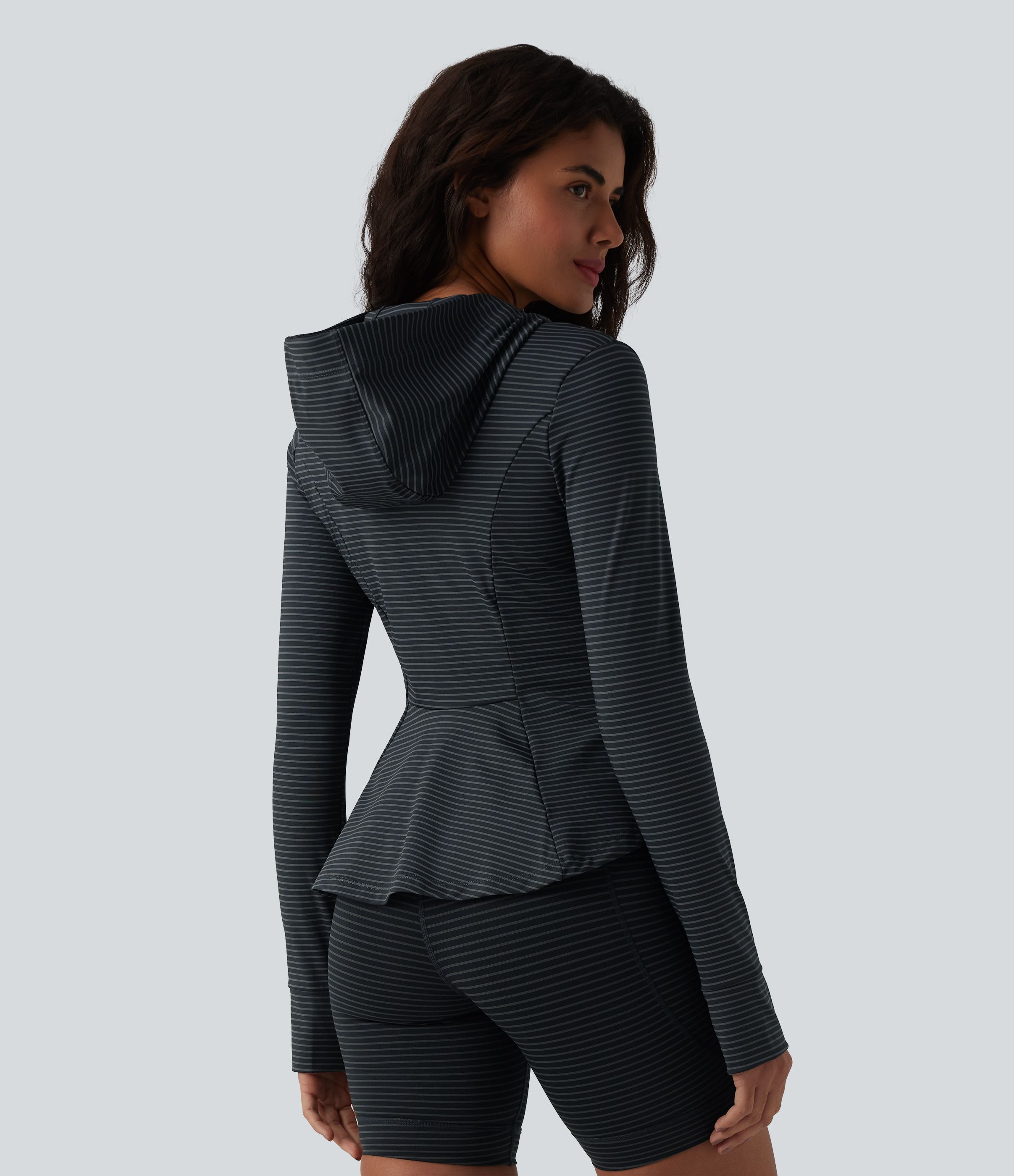 Hooded Long Sleeve Thumb Hole Stripe Yoga Jacket with Pockets