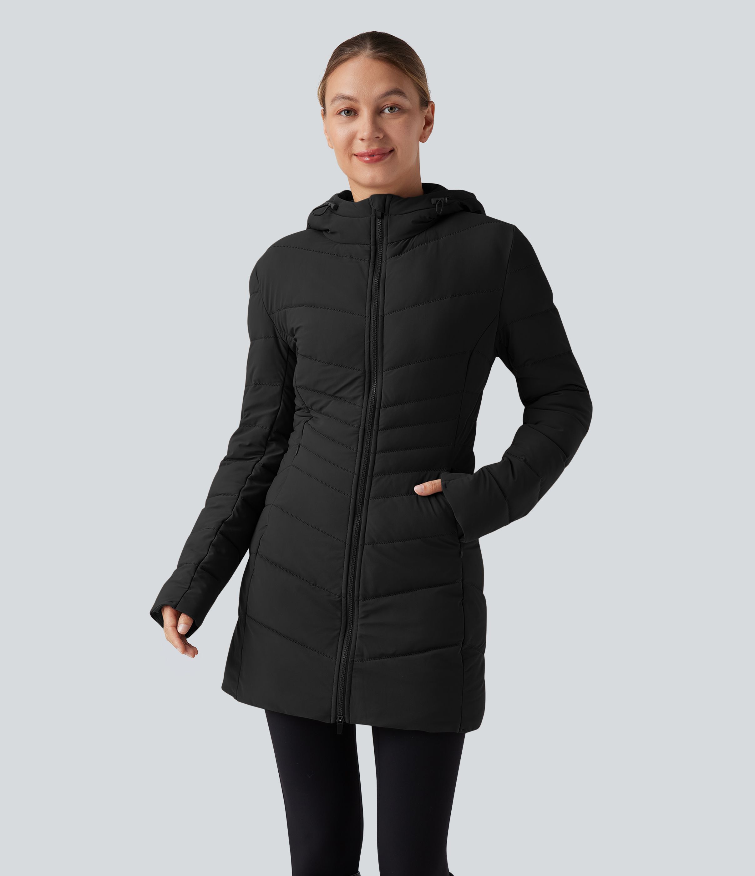 Huppullinen, pitkä, joustava ja rento toppatakki taskuilla