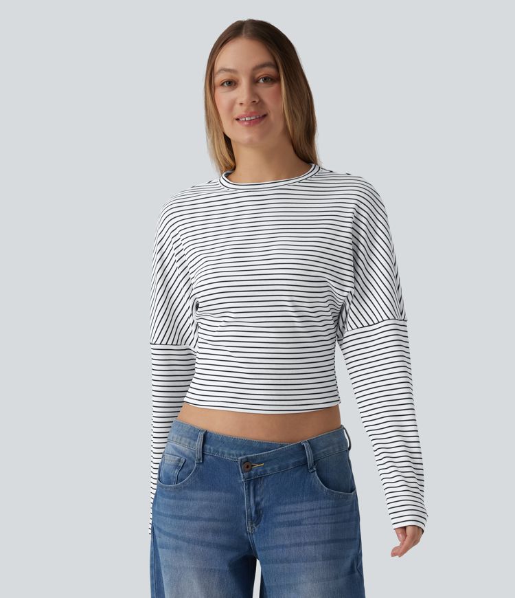 Žebrovaný pruhovaný top z úpletu s kulatým výstřihem a dlouhým rukávem