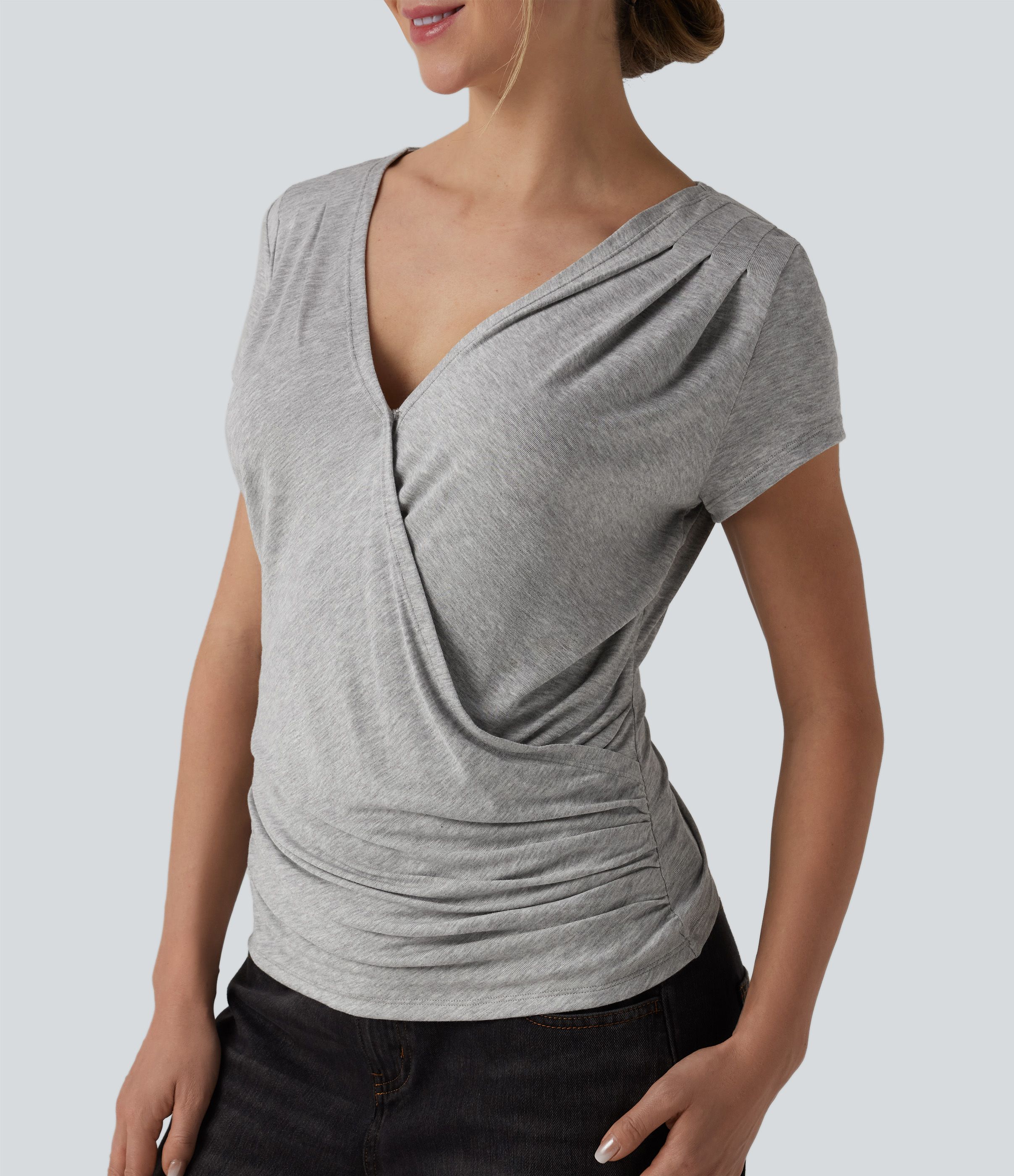 Ribstrikket meleret top med V-udskæring, korte ærmer, krydset front, rynket detalje og trykknapper — afslappet
