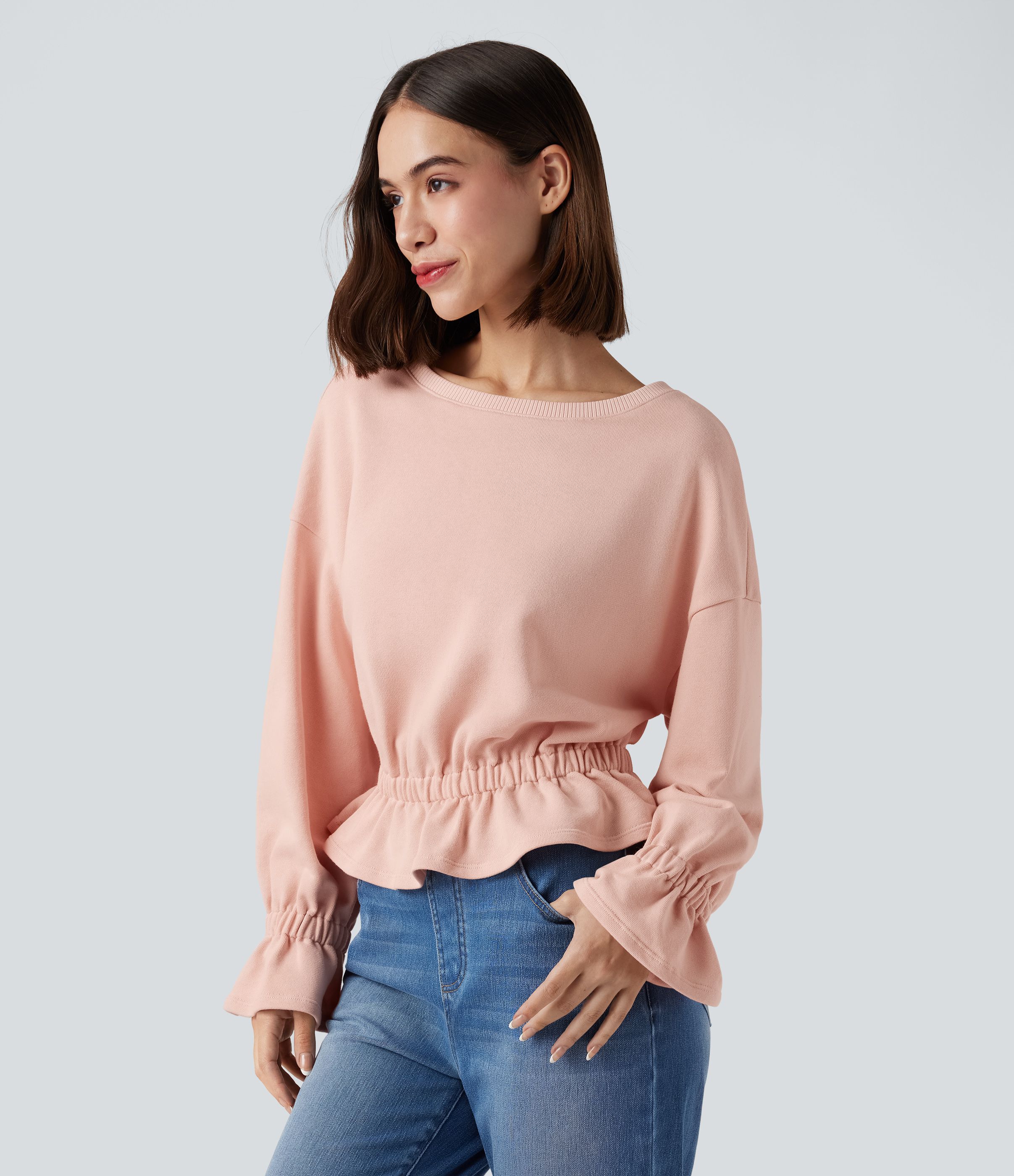 Round Neck Long Sleeve Ruffle Hem Casual Cotton Sweatshirt