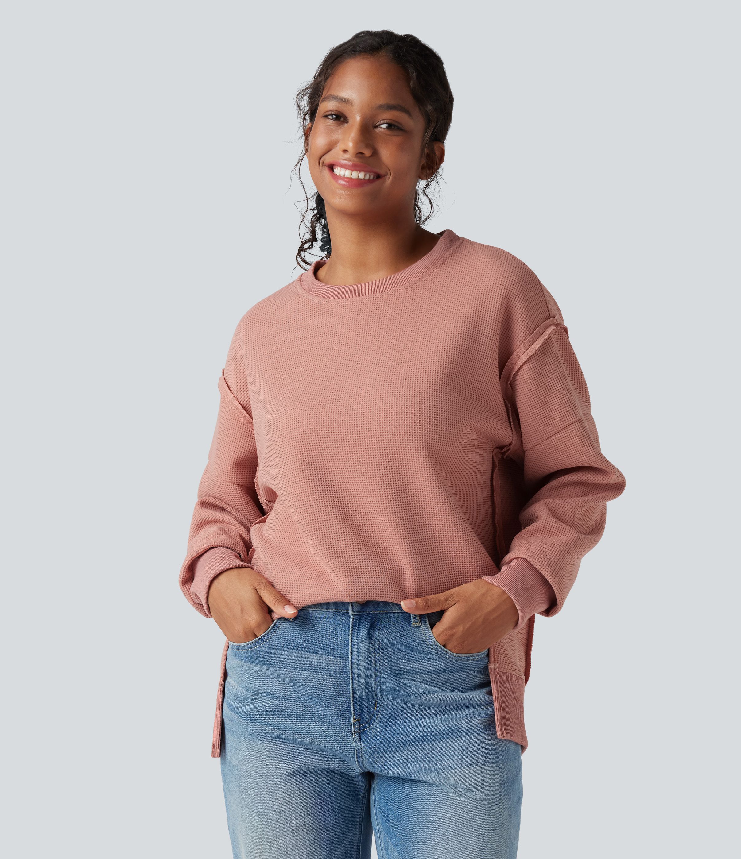 Ikdienas džemperis ar apaļu izgriezumu, garām piedurknēm, vafeļu tekstūru un šķēlumu apakšmalā