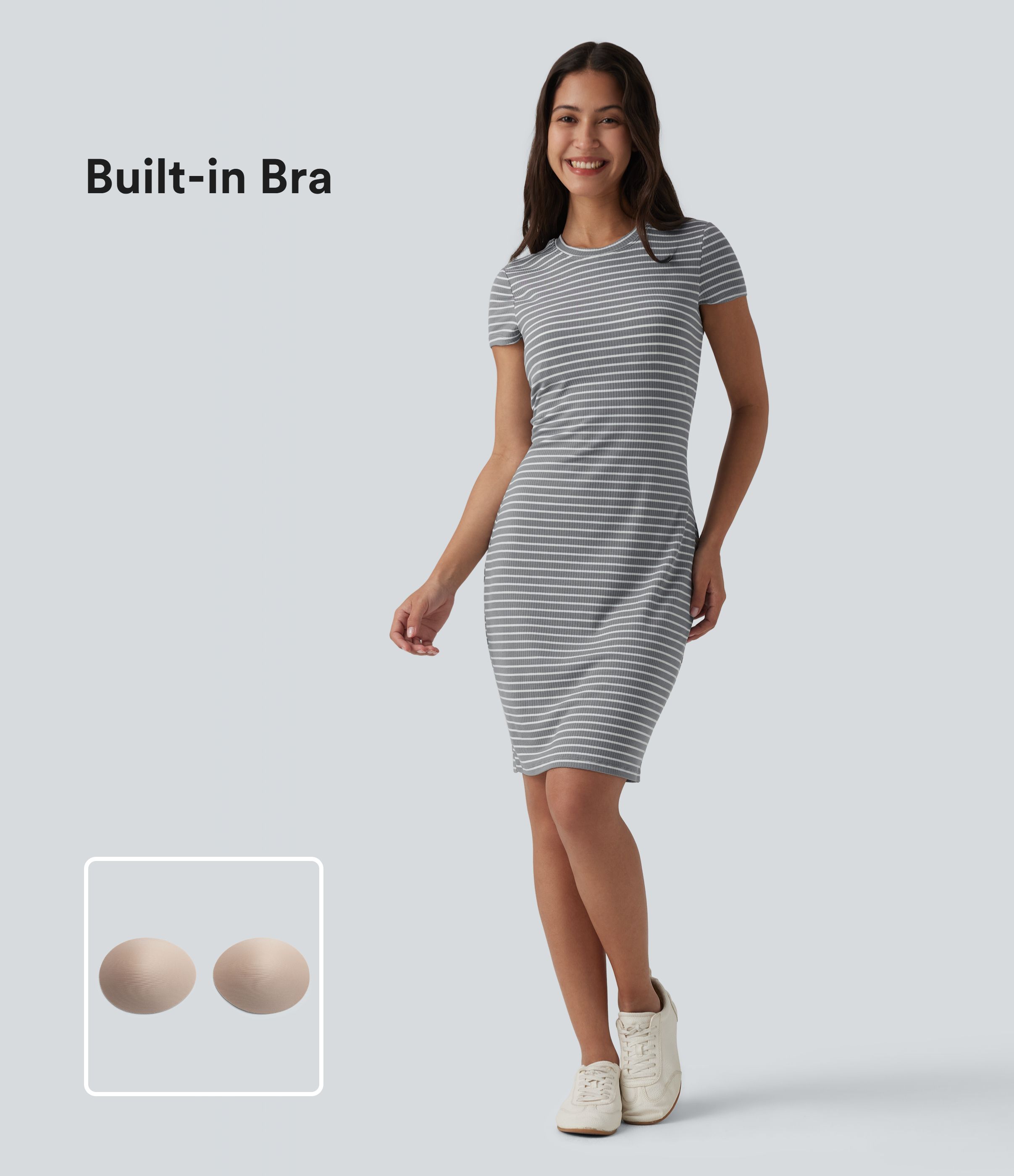Round Neck Short Sleeve Built-in Bra Stripes Bodycon Mini Casual Dress