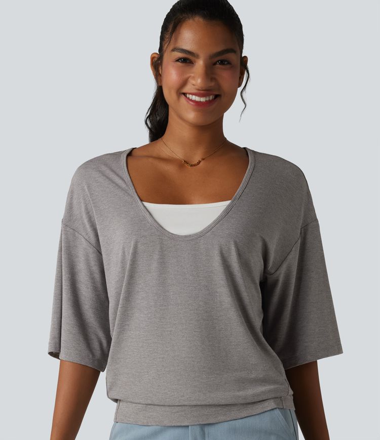 Scoop Neck Half Sleeve Color Block Casual Top