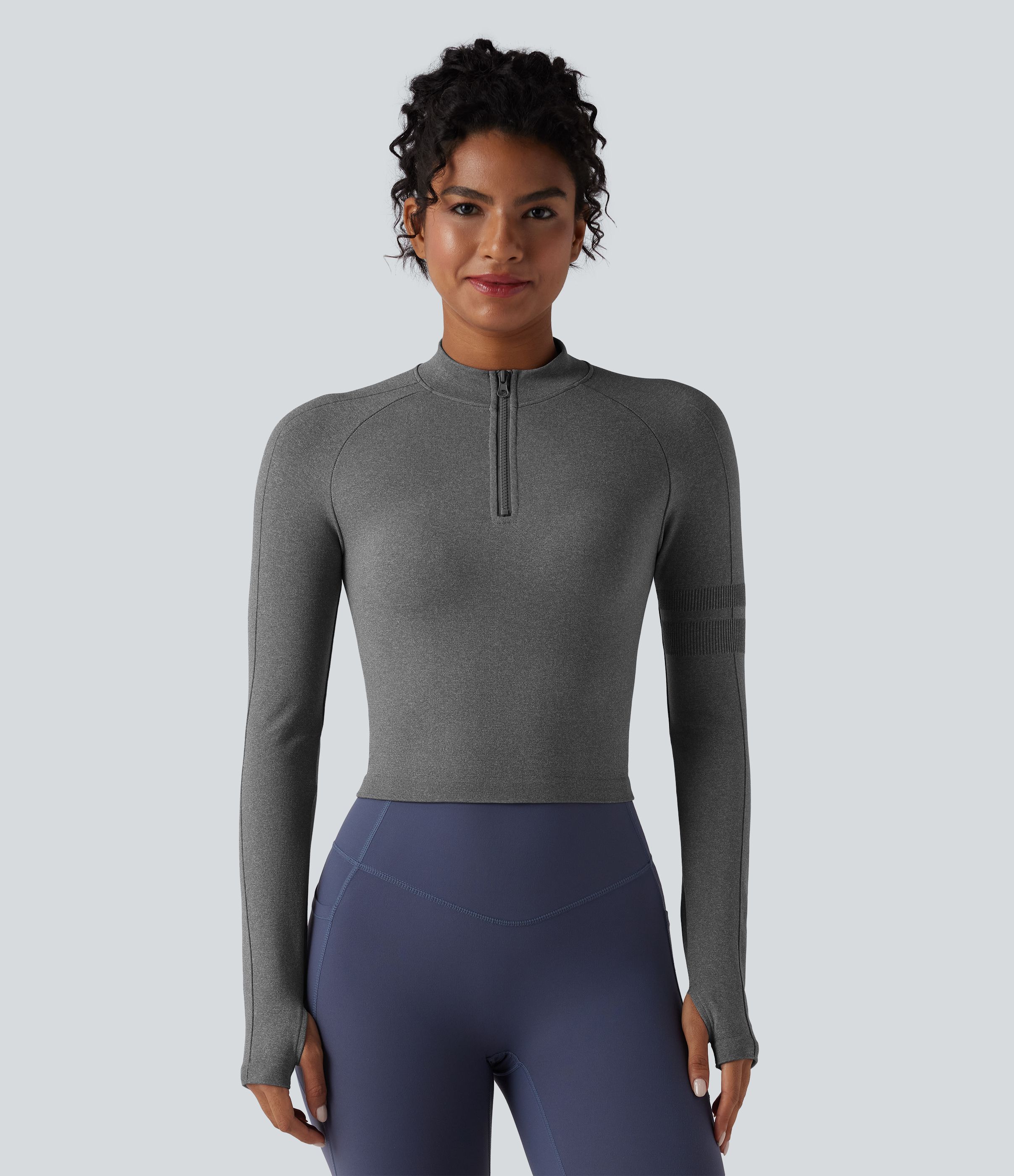Dikişsiz, yarım fermuarlı, uzun kollu yoga spor üstü, başparmak deliği