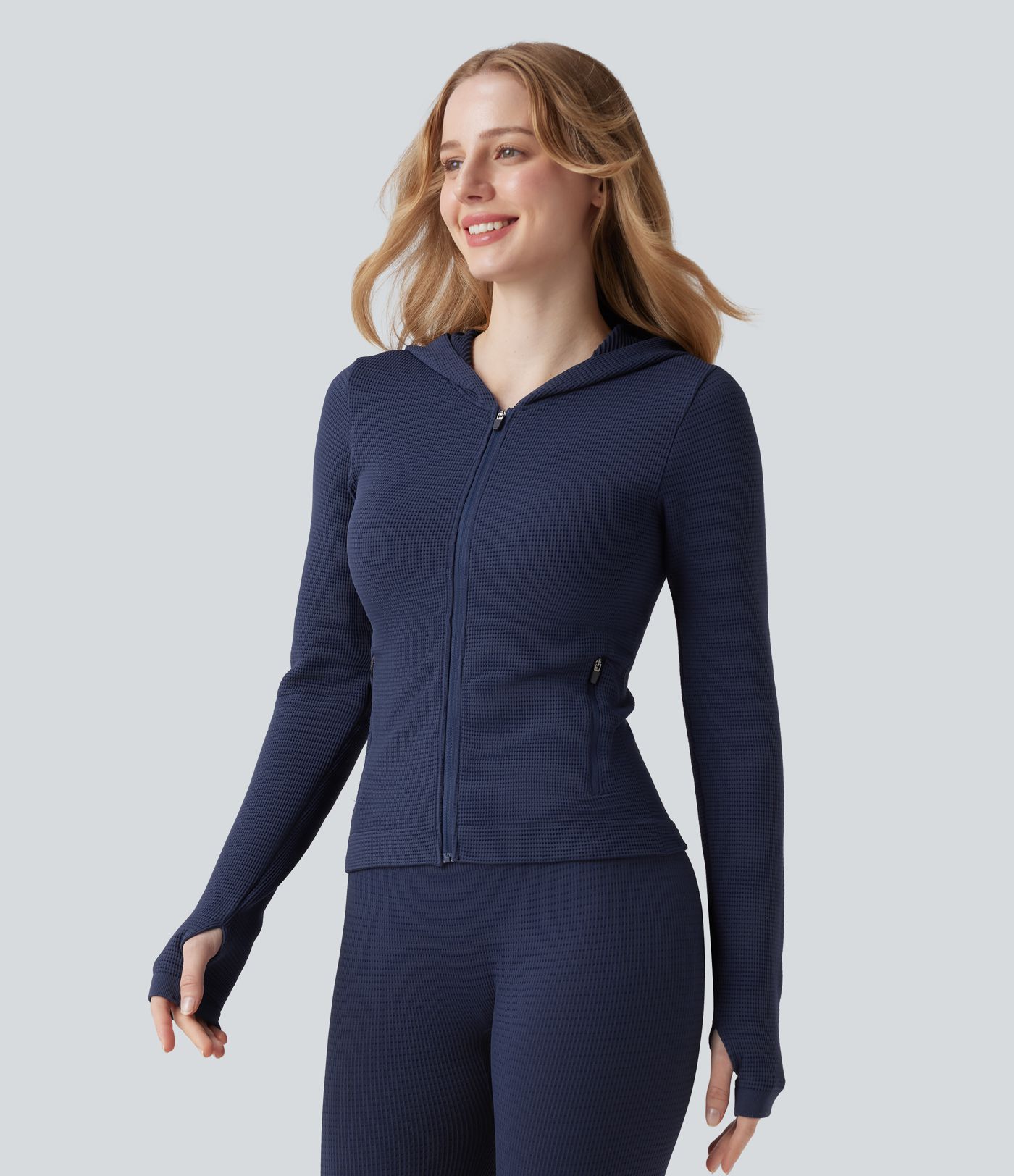 OneForm Seamless Flow Waffle Hooded Long Sleeve Thumb Hole Zipper Yoga Jacket with Pockets