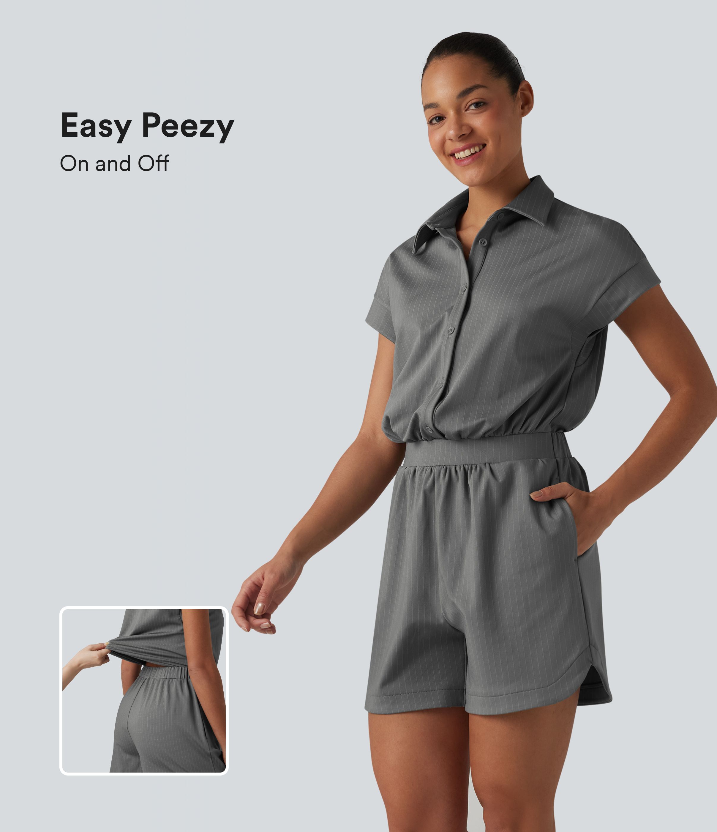 Paskowany casualowy kombinezon w styli koszuli z krótkimi rękawami i kieszeniami — edycja Easy Peezy