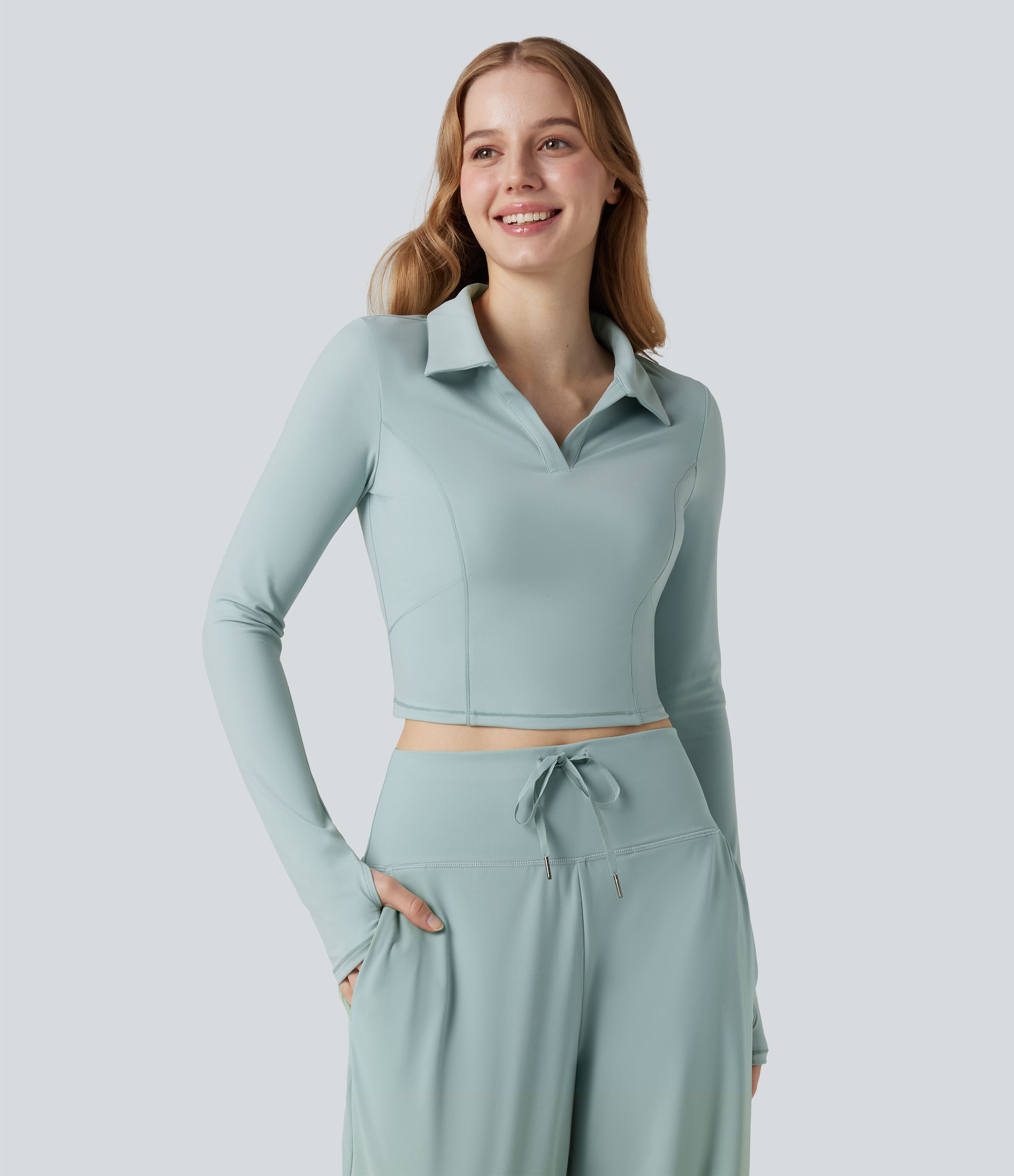 SoftlyZero™ polo in morbido tessuto plush, maniche lunghe, foro per il pollice, top corto sportivo da tennis