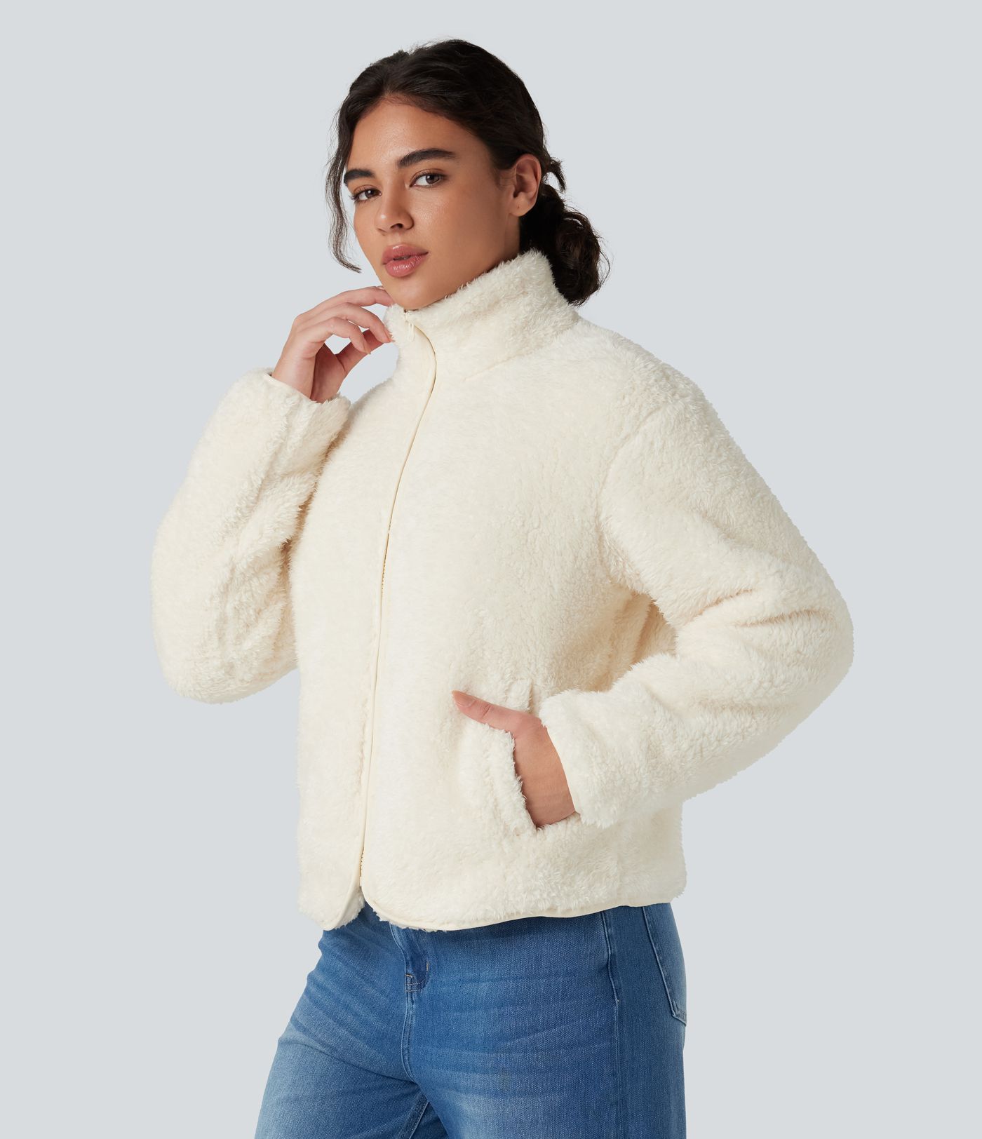 Stand Collar Long Sleeve Casual Sherpa Jacket with Pockets
