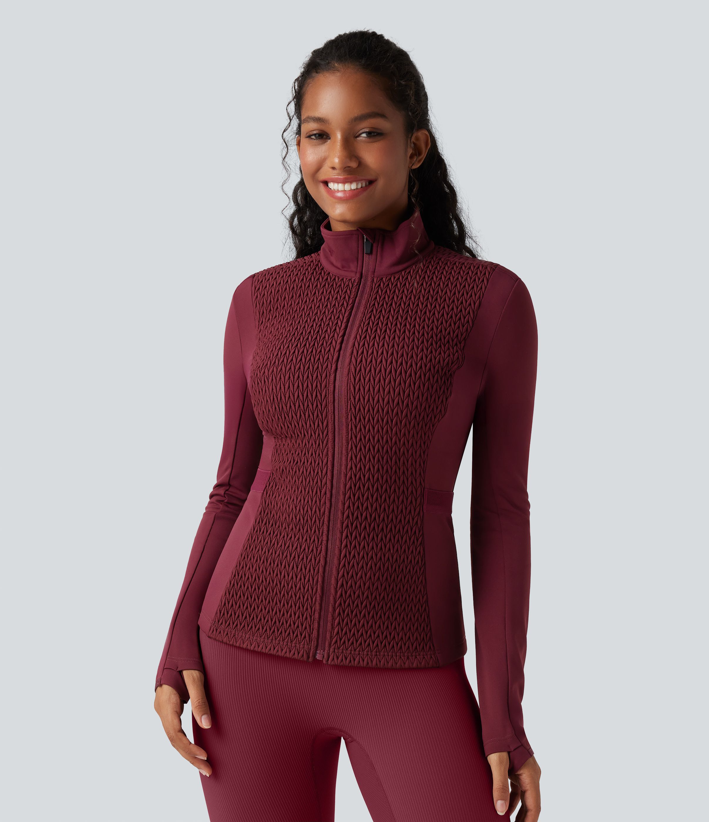 Stand Collar Long Sleeve Thumb Holes Shirred Workout Padded Jacket with Pockets
