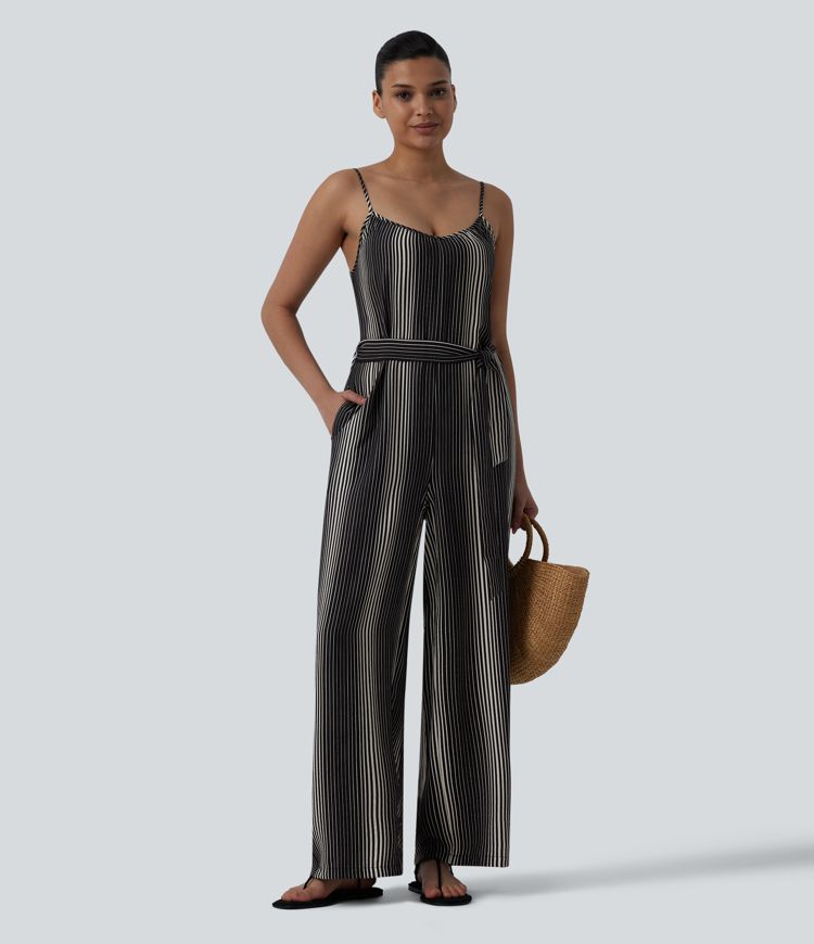 Tie Side Stripe Casual Slip Jumpsuit with Pockets