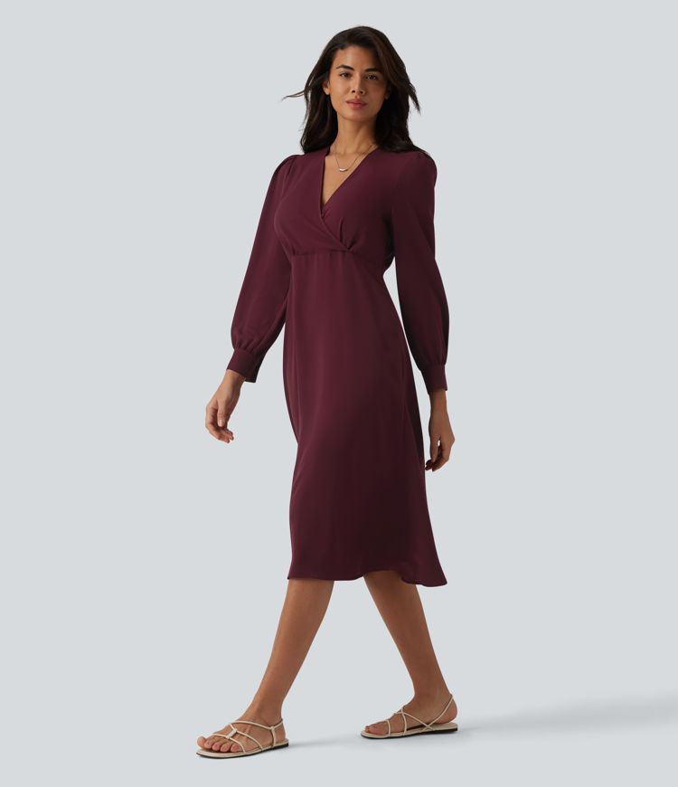 V yakalı uzun kollu midi günlük elbise