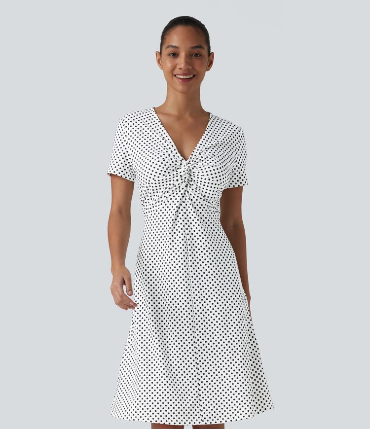 V Neck Short Sleeve Polka Dot Knee Length Casual Dress