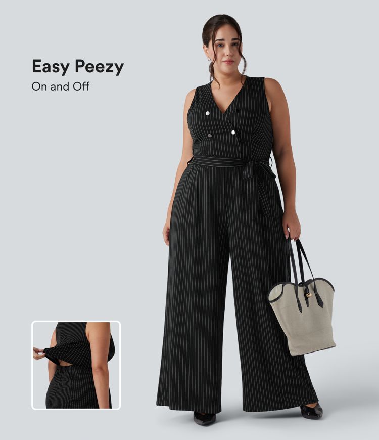 V Neck Sleeveless Belted Stripe Cool Touch Work Plus Size Jumpsuit with Pockets-Easy Peezy